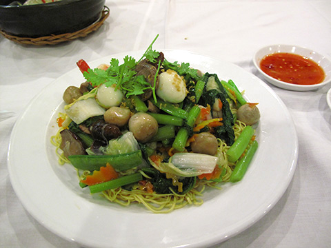 海老、イカ、レバー、椎茸などの野菜が入った焼きそば。