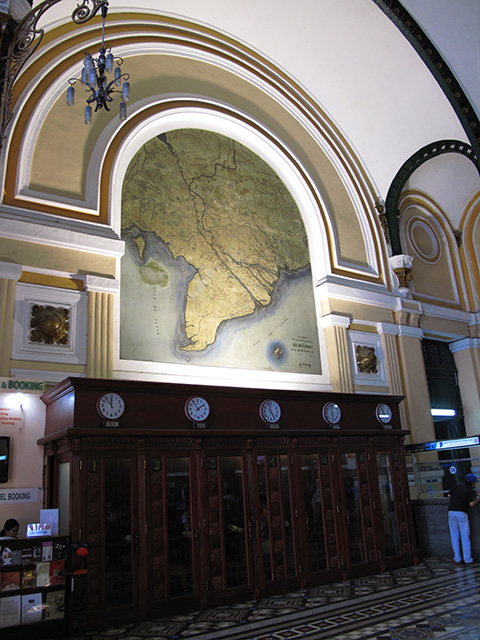 蒲鉾状の天井が特徴的な内部は両側に駅の切符売り場のように窓口が並んでいて正面にはお約束のホーチミンの肖像画。