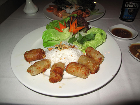 春巻きの方はソウメン状のものが付け合わせになっていたがこちらは網状になったライスペーパーをくるくると巻いたものが一緒に出てくる。