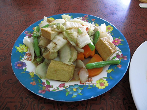 揚げ豆腐、野菜入りの炒め物。