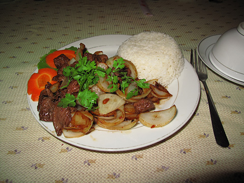 歩き方ではベトナムのサイコロステーキとして紹介されていたがこの店のはちょっと厚めの牛肉を細かく切ってタマネギと一緒に炒めたものでライス付き。