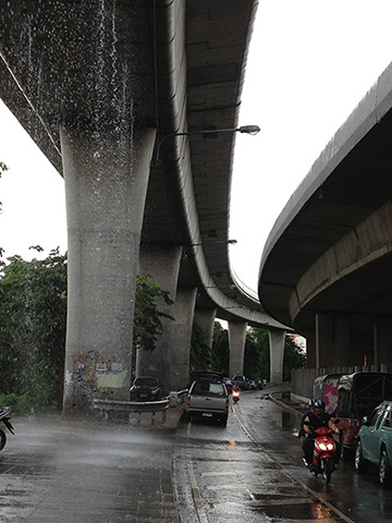しかたなくウタカット通り方面に歩いていくと、高架道路やBTSの軌道からあふれた水が滝のように落ちてきていた。