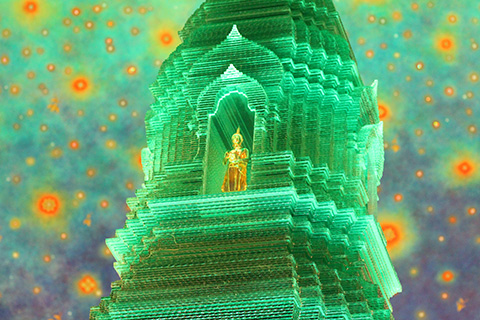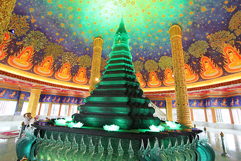 そしていよいよ最上階にはエメラルドに輝く仏塔、その上部には黄金色の仏像がはめ込まれている。
