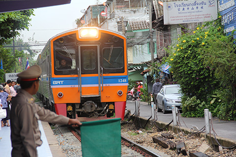 一通り写真を撮り終えてBTSの駅まで戻ろうかと出ようとしたところへマハチャイ行きの列車が入ってきた。